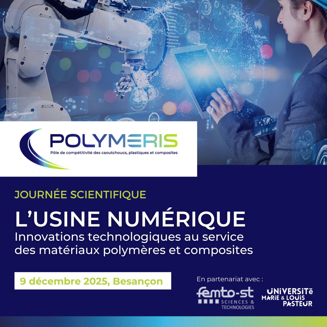 Polymeris organise la journée Scientifique annuelle Polymeris le 9 décembre 2025 à Besançon. Elle portera sur le volet "Usine Numérique" de notre feuille de route technologique avec dans l’idée de mettre en lumières des projets de R&D portant sur le monitoring des procédés, l’intégration d’IA dans les process ou la recherche de nouveaux matériaux, la digitalisation, l’utilisation du numérique à des fins de prédiction, … Au programme : - MS4ALL : Plateforme innovante pour étudier la (bio)dégradabilité des micropolluants par la simulation moléculaire et l’IA