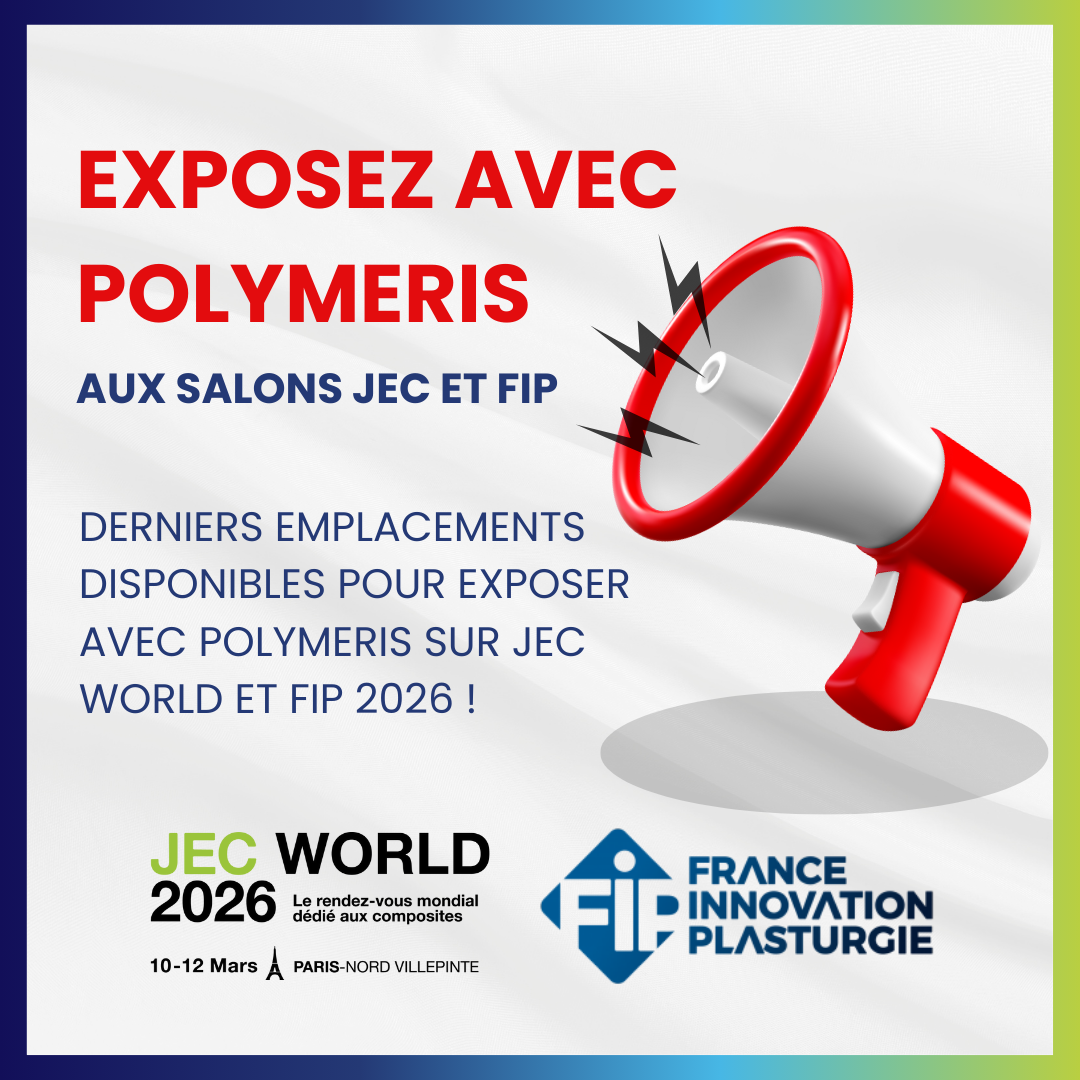 | | | Derniers emplacements disponibles pour exposer avec Polymeris sur JEC World et FIP 2026 ! | | Ne manquez pas cette opportunité de rejoindre Polymeris sur deux salons incontournables de l’industrie en France en 2026 : JEC World et FIP. Nous vous proposons une offre clé en main pour exposer dans un espace collectif, bénéficier d’une visibilité renforcée et profiter de la dynamique du réseau Polymeris. | | | | | | | | | | | ACTUALITÉS DE NOS PROJETS |