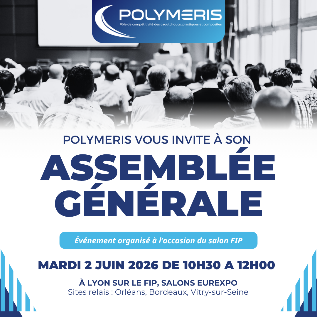 | | | Assemblée Générale Polymeris 2026 | | L’Assemblée Générale 2026 de Polymeris se tiendra cette année dans le cadre du salon FIP, événement majeur de la filière plasturgie et composites. Ce rendez-vous sera l’occasion de partager le bilan de l’année écoulée ainsi que les perspectives stratégiques du pôle. Dans la continuité du format multisite, particulièrement apprécié, la participation sera également possible depuis nos sites relais de Bordeaux, Orléans et Vitry-sur-Seine. ⭐ Nouveauté 2026 : vote par anticipation Le représentant légal de chaque entité adhérente recevra prochainement par email un lien permettant de réaliser un vote en ligne en amont de l’Assemblée Générale. L’Assemblée Générale sera suivie d’un cocktail sur le pavillon Polymeris, afin de prolonger les échanges dans un cadre convivial au cœur du salon FIP. | | | | | Ajoutez l'événement à votre agenda : | | | | | | | | ACTUALITÉS DE NOS PROJETS |